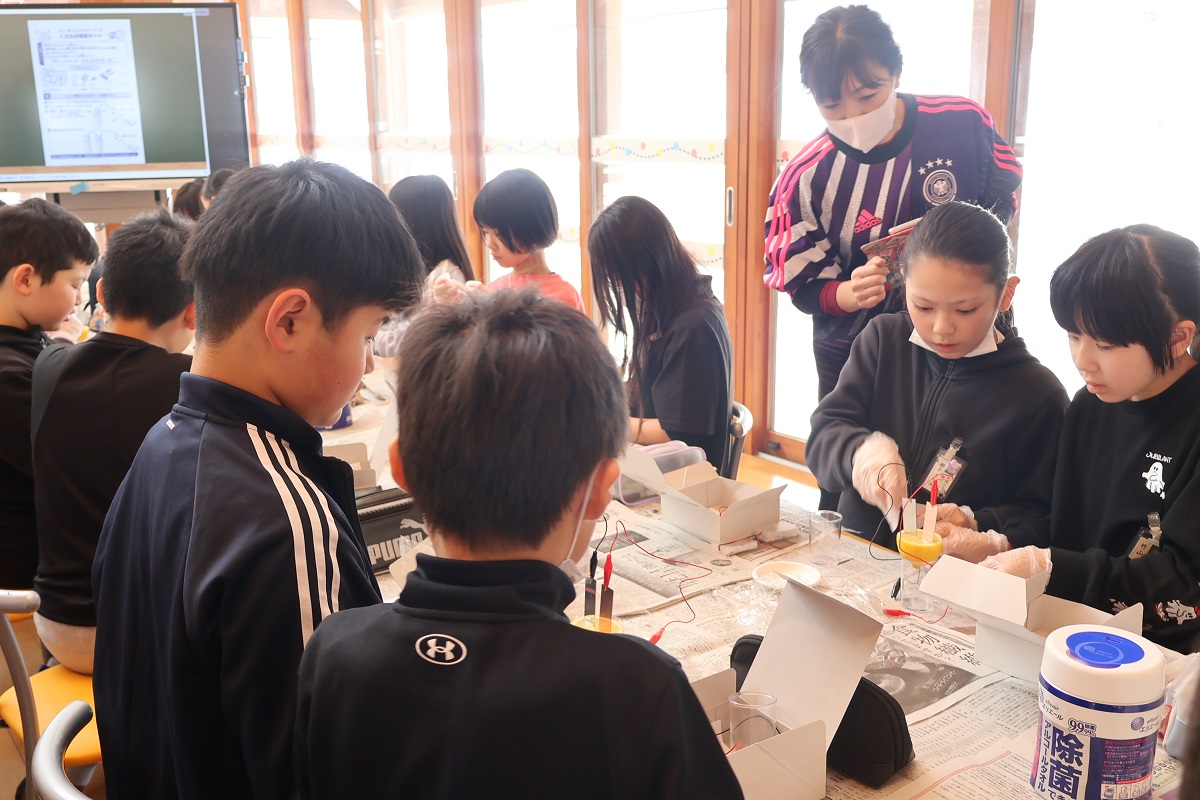 4年生は、レモンを使った果物電池や太陽電池を使って電子メロディを鳴らしたり、静電気で浮かぶ電気クラゲの実験を行ったりしました。