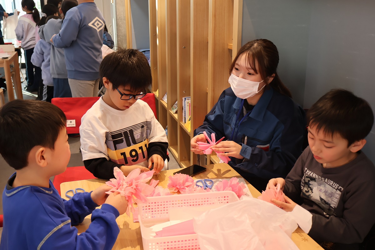 細かい作業も多く、集中力のいる工作でしたが真剣に話を聞きながら、とても上手に作っていました。完成した枝垂桜はブックコーナーの窓際へ展示しているので、ぜひご覧になっていただければと思います。