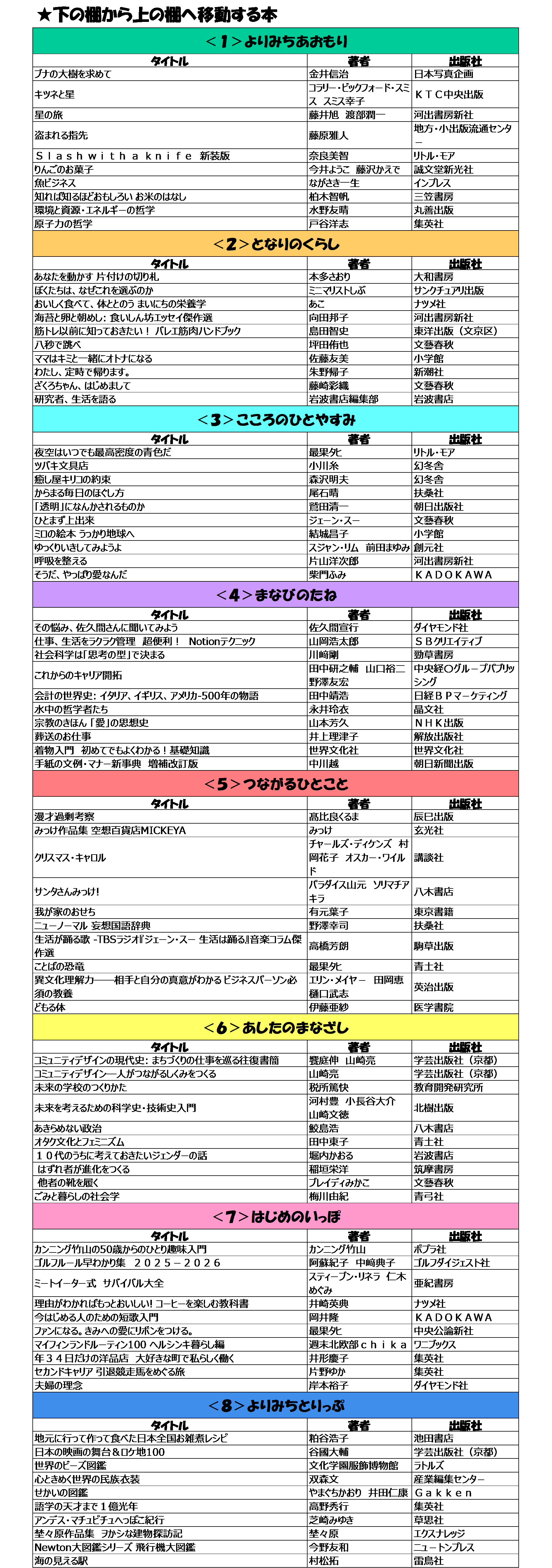 下の棚(手の届く範囲)と上の棚(上段2段)を各テーマ10冊程度の入替となります。