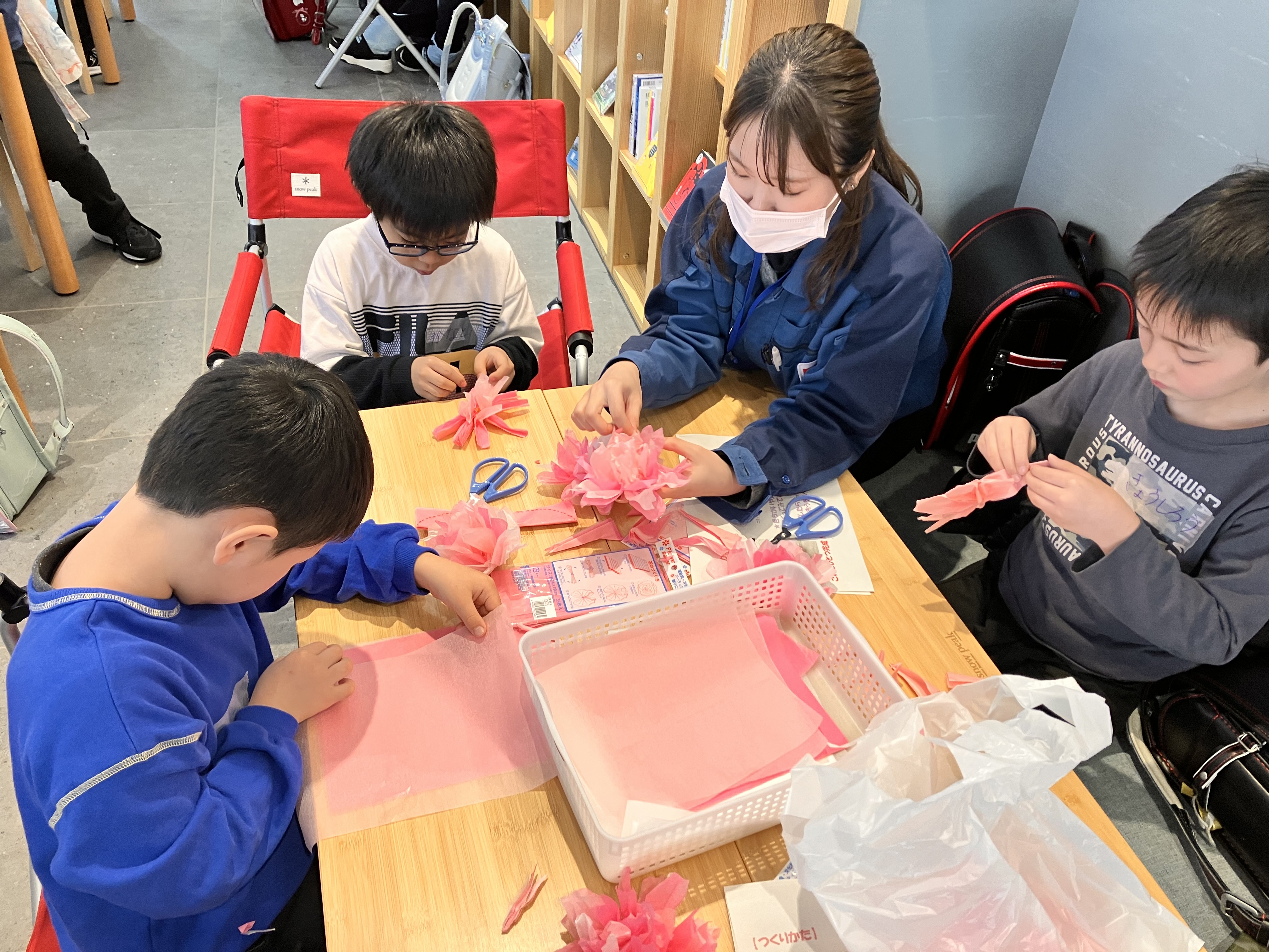 宿題タイムが終わると、机にはさくらの花を作る材料が用意されました。