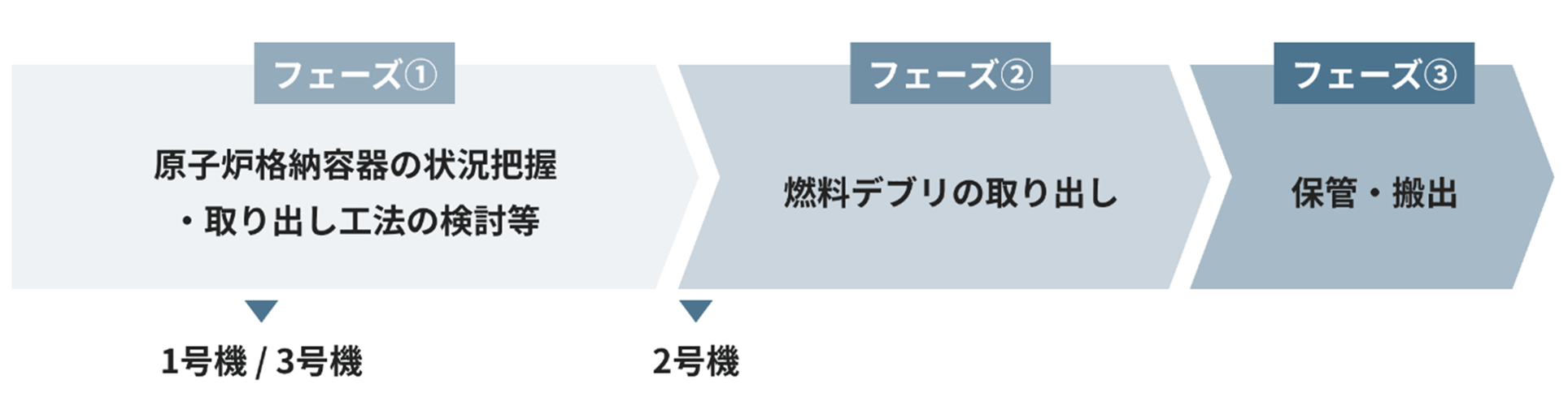 作業工程は3つのフェーズに分けられます。現在は、遠隔操作ロボットを活用しながら、原子炉格納容器の内部調査を行っています。また、取り出し作業における「現場の放射線線量が比較的低く、早期に原子炉格納容器内部にアクセス可能」等の状況から「2号機」を燃料デブリ取り出しの初号機に設定しました。