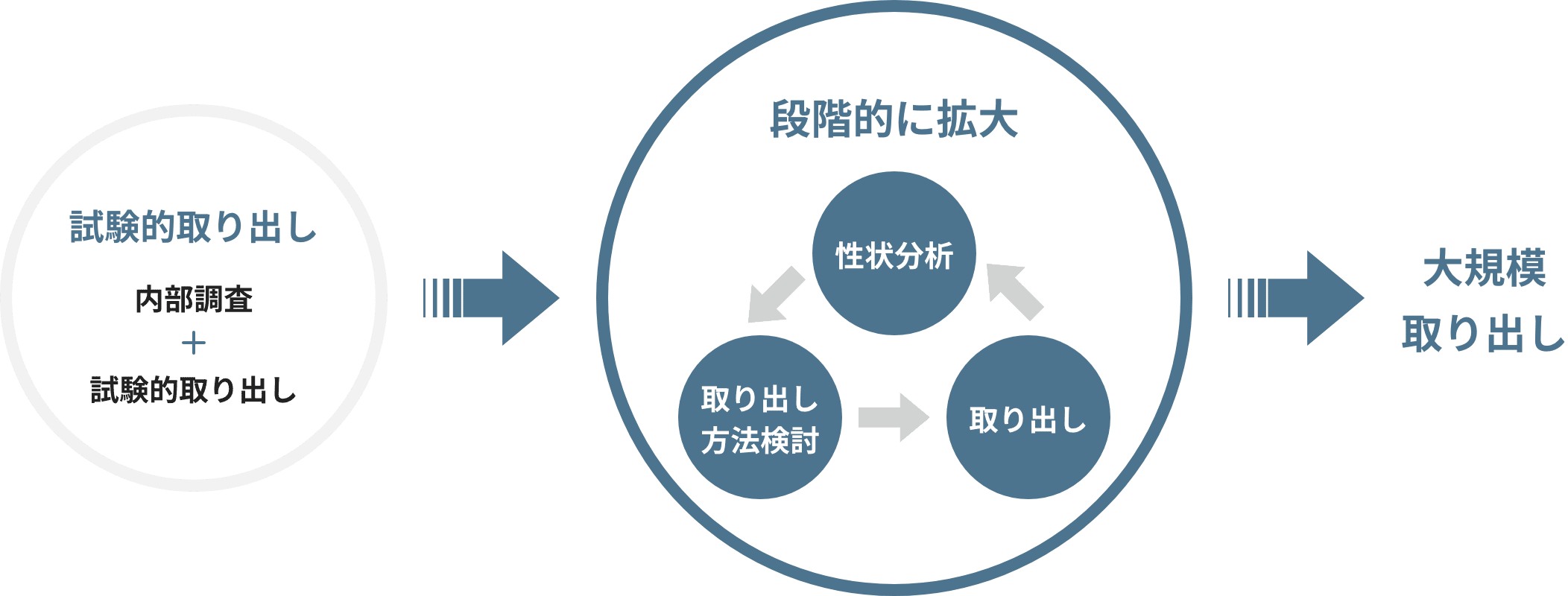 そして、原子炉格納容器内部調査や試験的取り出しで得られた情報をもとに専用の取り出し装置を開発し、燃料デブリの取り出し規模を段階的に拡大していく、「ステップ・バイ・ステップ」の一連の作業として進めていきます。