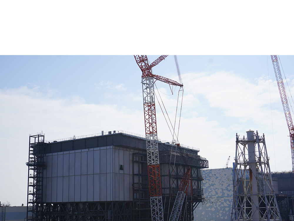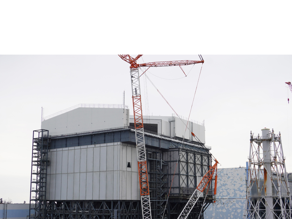 1号機側の高台から南方向に、手前から1、2、3、4号機を撮影しています。