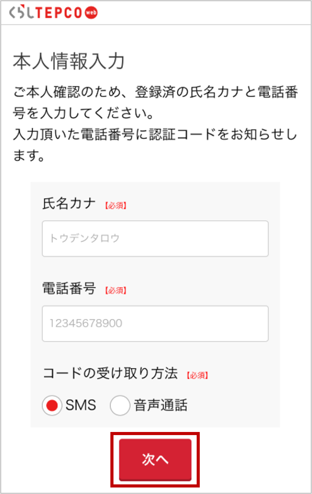 2本人情報入力画面で必須事項を入力、認証コードの受け取り方法を選択して「次へ」をクリック