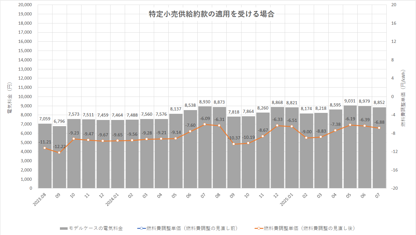 モデル料金は、契約種別:従量電灯B、契約電流:30A、使用電力量:260kWhにて算定しています。なお、料金単価は2024年2月分から2024年3月分までは2023年6月1日実施の特定小売供給約款、2024年4月分から2025年3月分までは2024年4月1日実施の特定小売供給約款、2025年4月分以降は2025年4月1日実施の特定小売供給約款を適用しています。