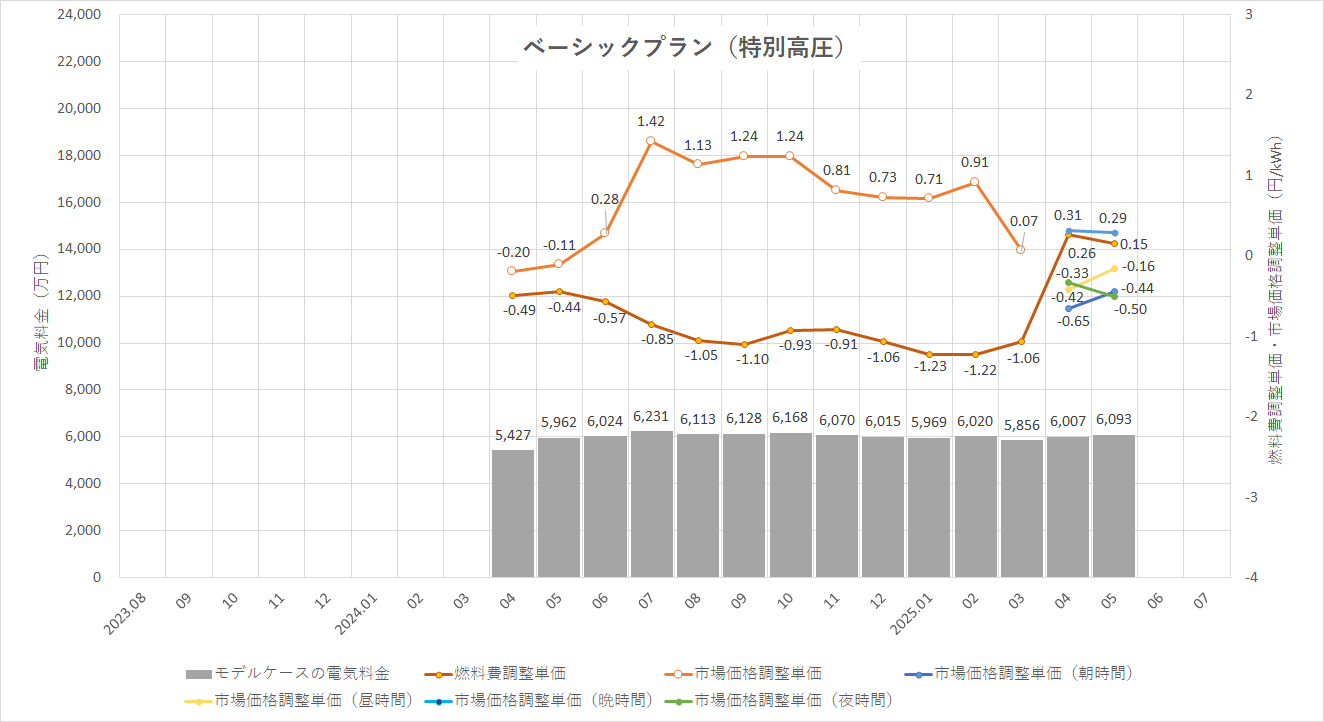 モデル料金は、契約種別:市場調整ゼロプラン、契約電力:6,000kW、使用電力量:2,400,000kWhにて算定しています。なお、料金単価は2024年4月分から2025年3月分までは2024年4月1日実施の電気需給約款[特別高圧]、2025年4月分以降は2025年4月1日実施の電気需給約款[特別高圧・高圧]を適用しています。