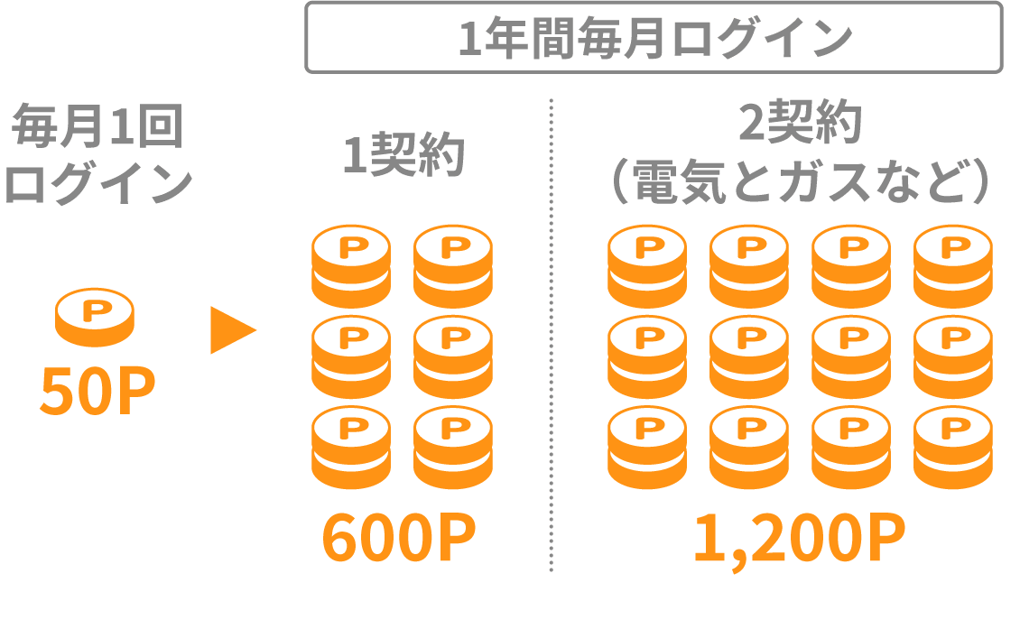 対象の電気・ガスの料金プランのご契約一つにつき50ポイントをご提供いたします。詳細はこちら