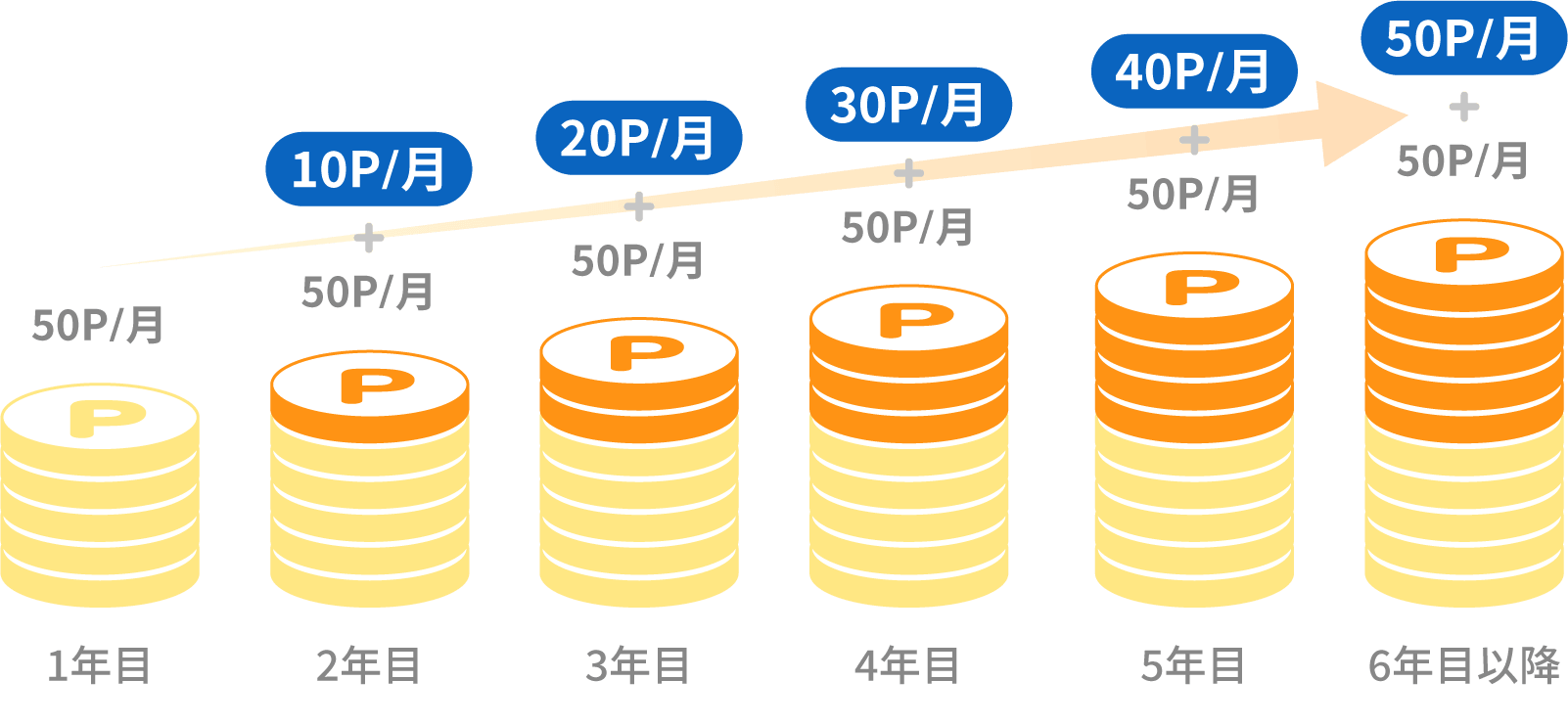 「長期利用ボーナス」はご利用継続6年目の50ポイントが上限となります。ご利用継続6年目以降、コミュニケーションポイントに毎月50ポイントの「長期利用ボーナス」が追加されます。