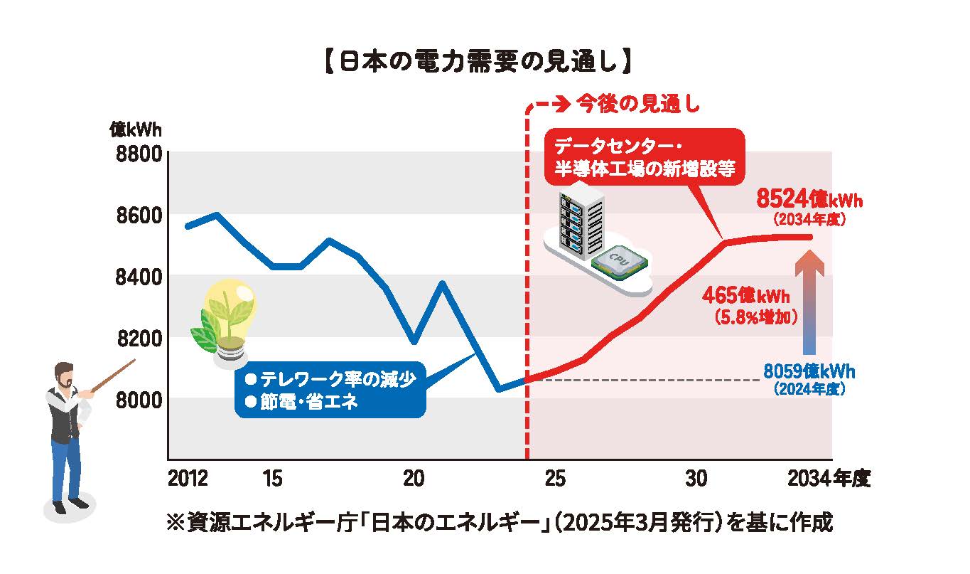デジタル化(DX)に伴い、これらの施設の新設・増設も相次ぐことから、国内の消費電力量は2034年度までに24年度比で約6%増える予想です。