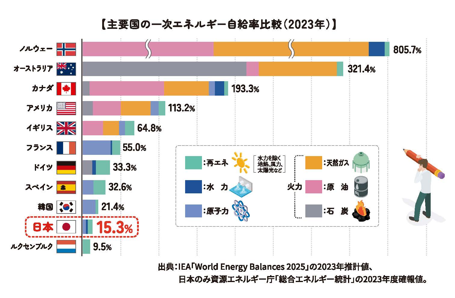 2023年度の日本のエネルギー自給率は約15%と、極めて低い水準となっています。