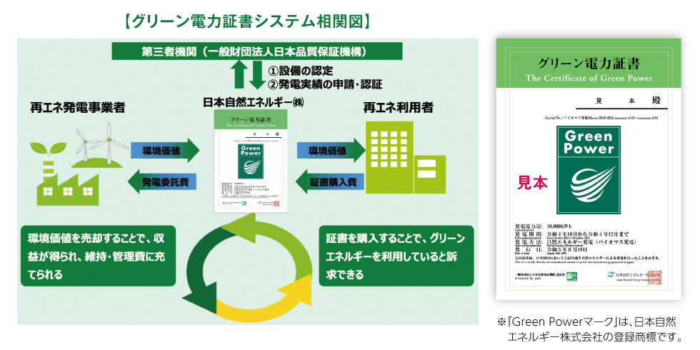 「グリーン電力証書システム」とは、風力発電や太陽光発電といった自然エネルギーにより発電された電気の環境付加価値を、証書発行事業者(日本自然エネルギー)が第三者機関(一般財団法人 日本品質保証機構)の認証を得て発行し、「グリーン電力証書」という形で取り引きする仕組みです。