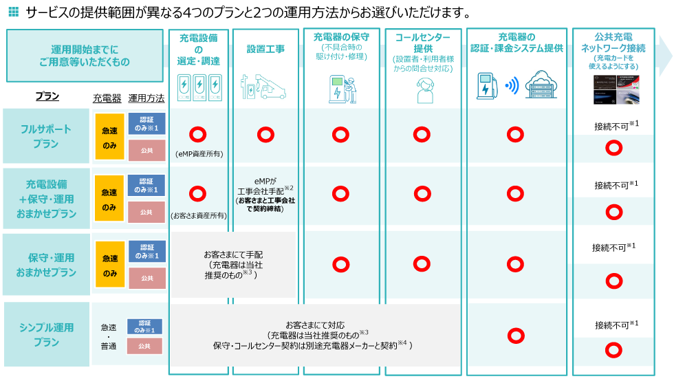 - お客さまのご要望に応じた、4つのプランをご用意。フルサポートプランなら、充電器の導入から保守運用までのすべてをお任せいただけます。