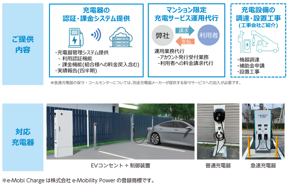 • 本ソリューション「e-Mobi Charge」導入物件の居住者さまは、e-Mobility Power会員サービス(A15)もご契約いただくと、1つのアカウントでマンションと外出先両方のEV充電器をご利用いただくことが可能です。