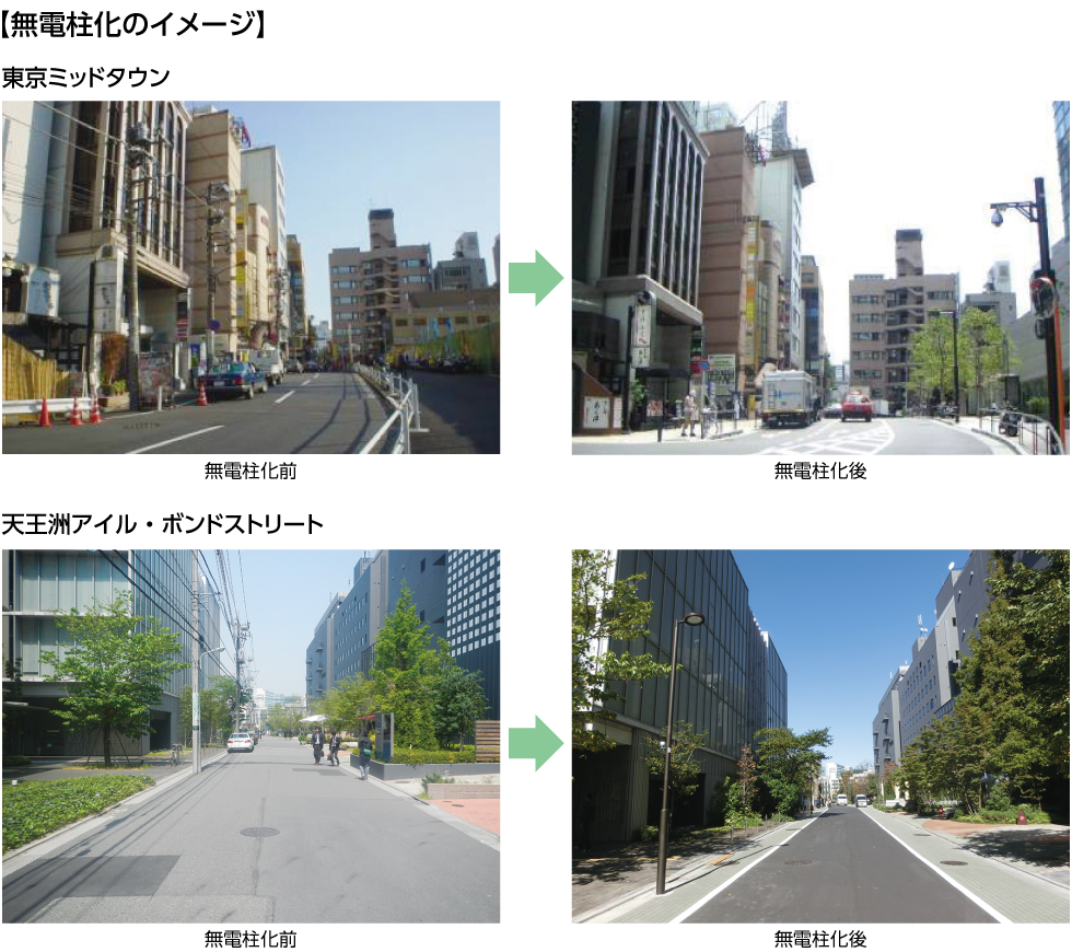 - 道路上の電柱や電線を撤去し、防災機能と景観を向上させると共に、安全で快適な歩行空間を確保いたします。