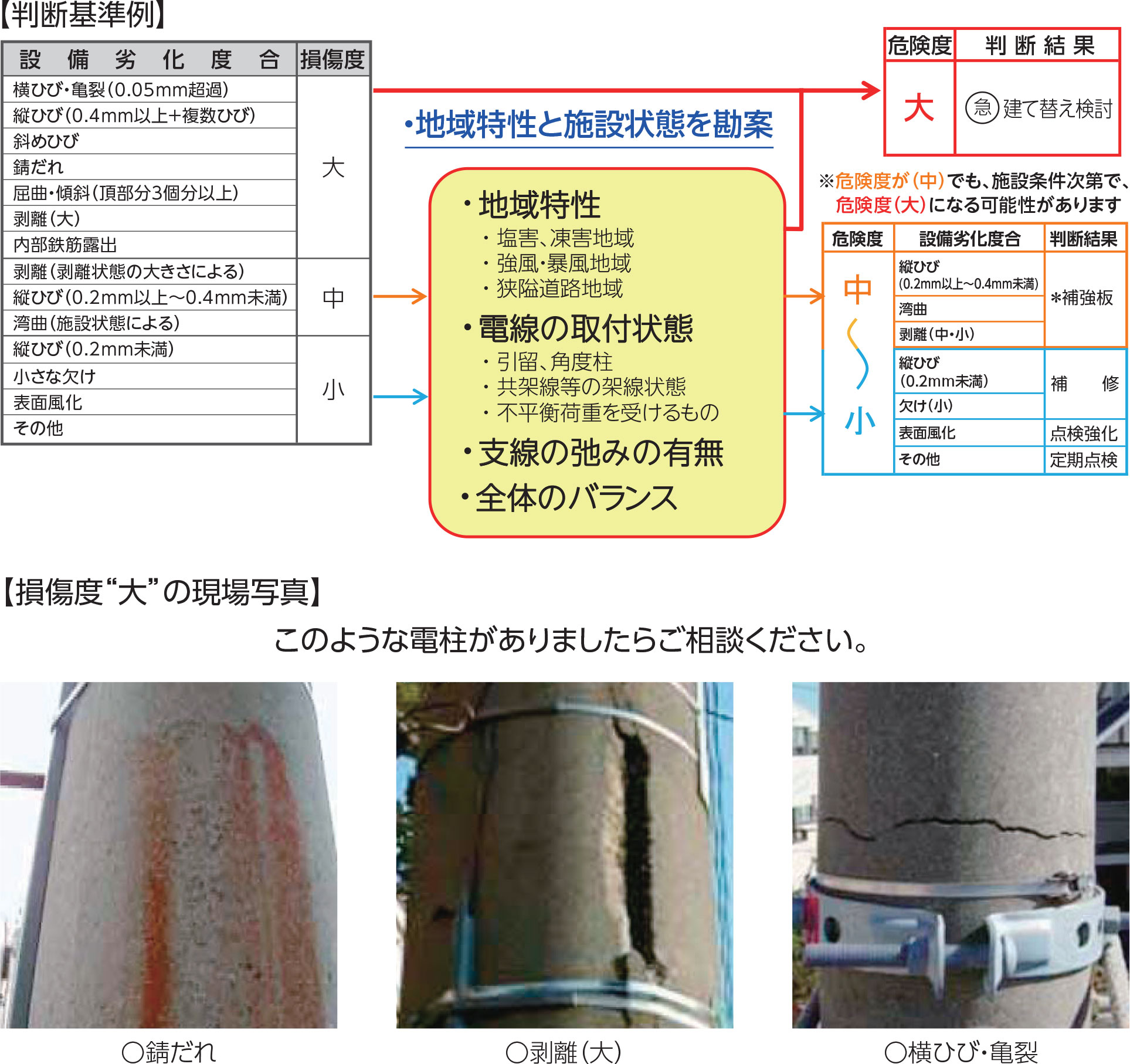 亀裂・剥離、ひび・風化・錆だれなど、お客さま構内のコンクリート電柱の劣化状況を診断し、3段階に劣化度合を分類。劣化度合に応じた対応などのご提案と、補修・補強・建て替えなどのサービスをご提供いたします。
