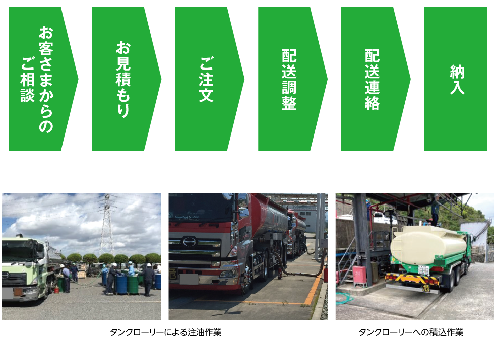 - お客さまのご依頼に応じて日時の指定やタンクローリーの大きさなど、状況に合わせた対応が可能です。