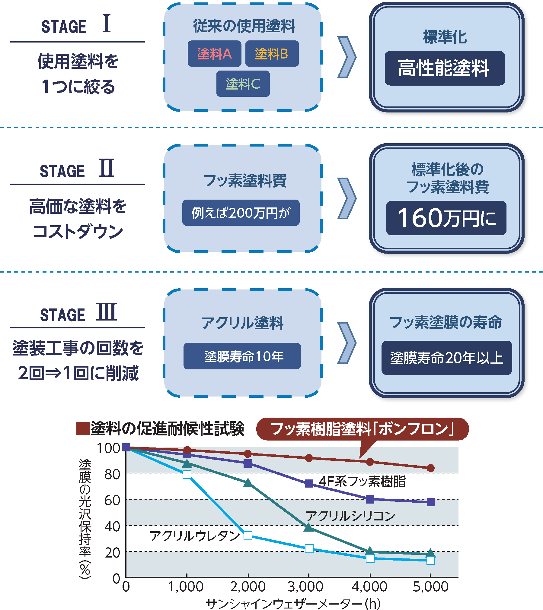 - ボンフロン(フッ素樹脂)を使用することにより、塗り替え周期を10年から20年に延長することが可能です。