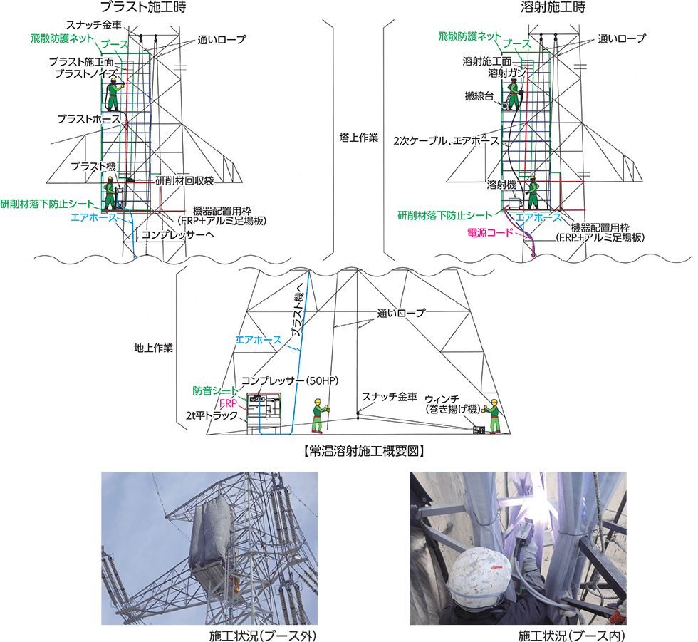 - 275kV以上の鉄塔では、線路停止なしでの施工が可能です(事前の現場確認が必要です)。