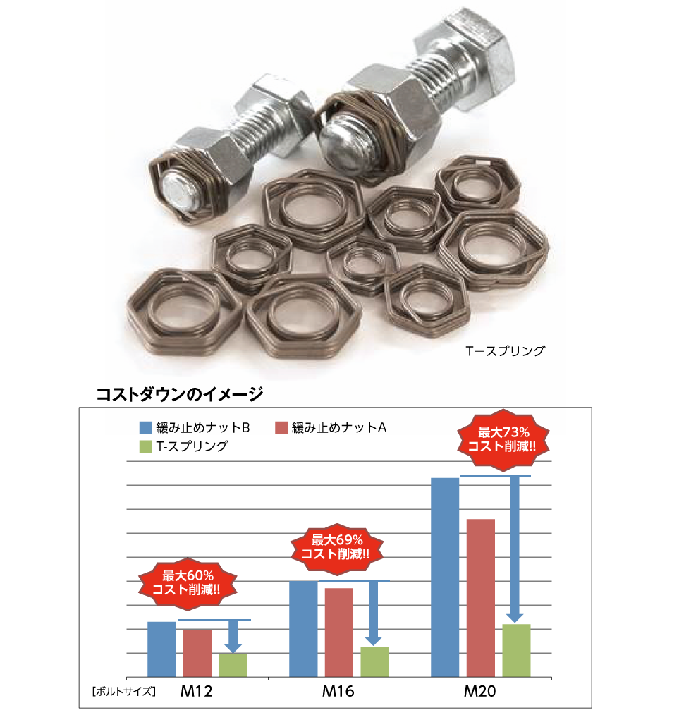 - 他の緩み止め対策品よりも高いコスト削減効果を見込めます。