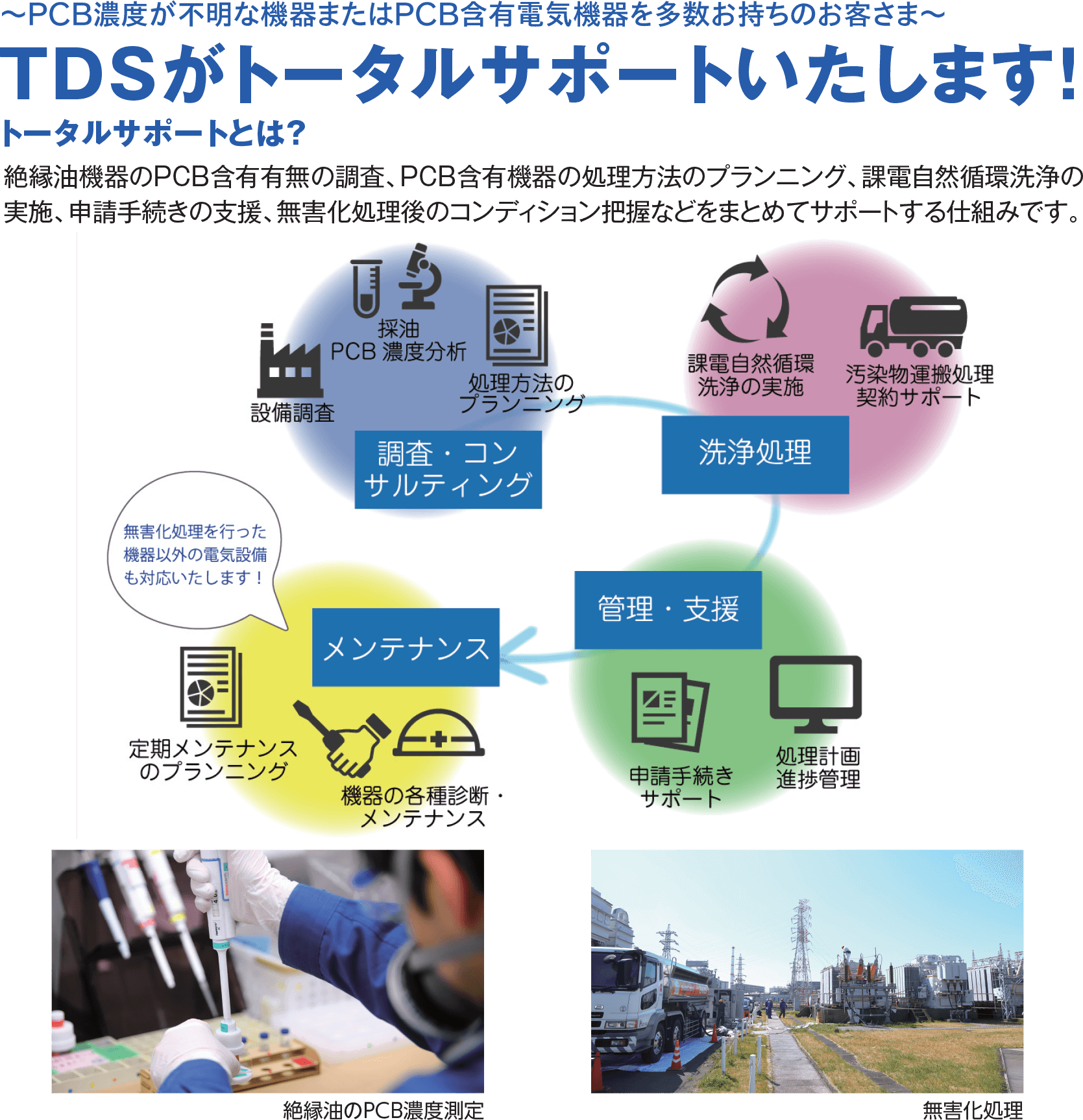 - 現状所有の設備調査・処理方法のプランニングから無害化処理実施、申請手続きのサポートまでをトータルサポートいたします。
