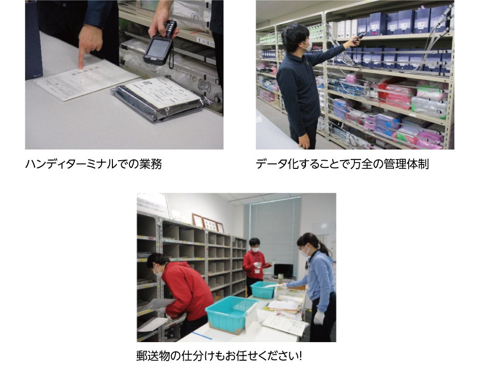 - 定型業務を丁寧かつ確実に処理するところに強みがあり、障がい者スタッフが活躍いたします。また、年1回の点検・照合業務や貸し出し業務など、QRコードやOCR読み取り機能を活用し、データ化するため品質も万全です。