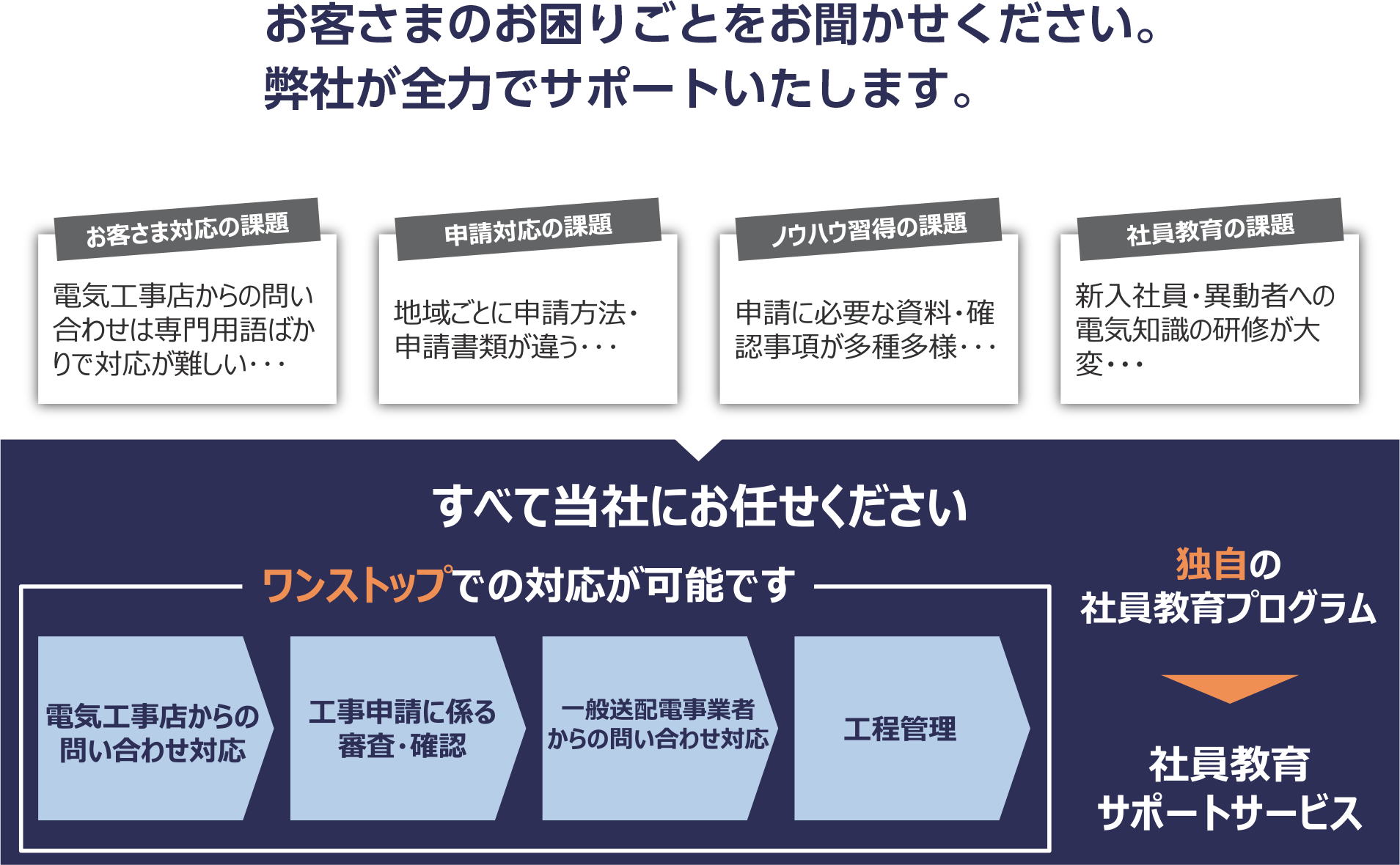 - 長年培った電気事業の実績と知識の豊富さを活かし、あらゆるお問い合わせ対応から工程管理まで一括で承ります。