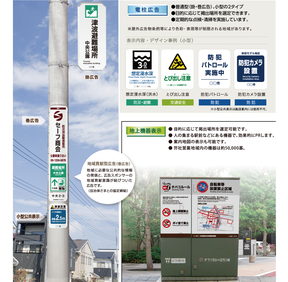 - 電柱を活用した公共表示(電柱広告:普通型・小型・地域貢献型)