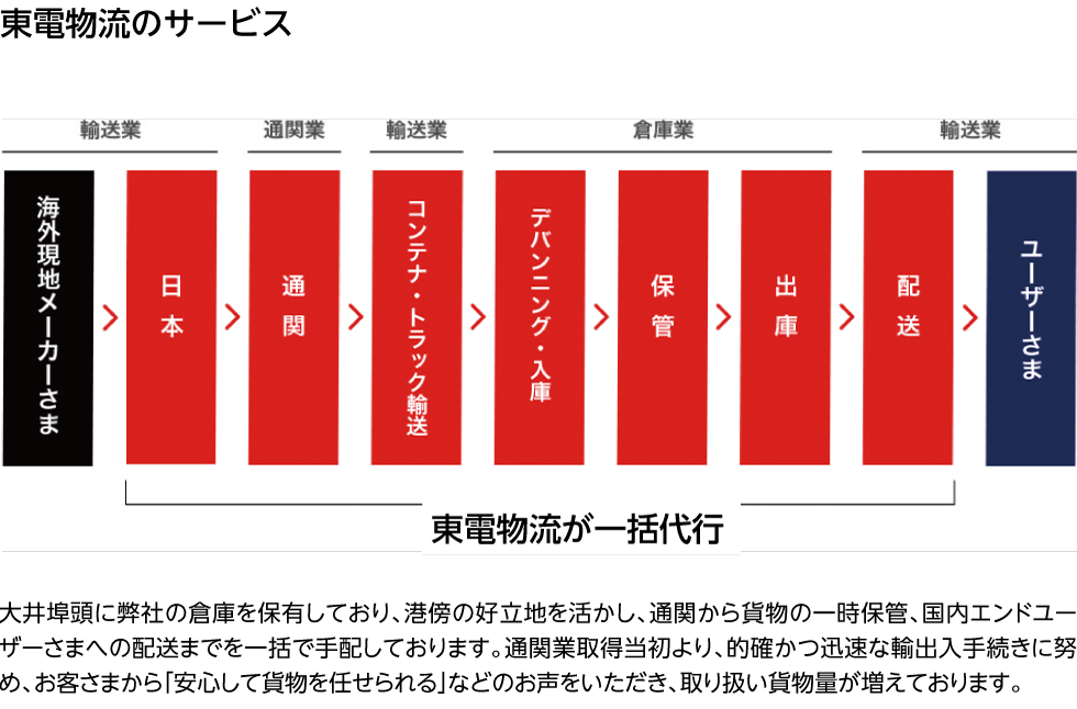 - 弊社は、2000年に通関業の許可を取得しました。輸送業および倉庫業との組み合わせ、ならびにパートナー企業との協働により、海外現地指定場所での引き取りから、日本国内指定先までの包括的な物流サービスを実現いたします。日本から海外、海外から日本への輸送も一括で手配いたします。