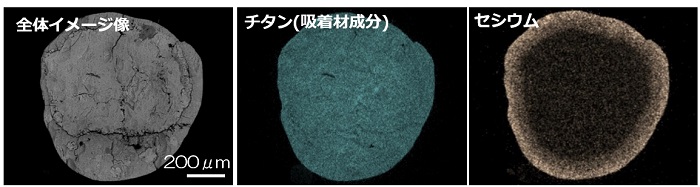 現状の吸着状況を確認したところ、吸着材の種類によっては、セシウムは、吸着材粒の表層だけにしか吸着していないことがわかりました。従って、粒中心部の高価な吸着材成分は無駄になっている場合があることがわかりました。