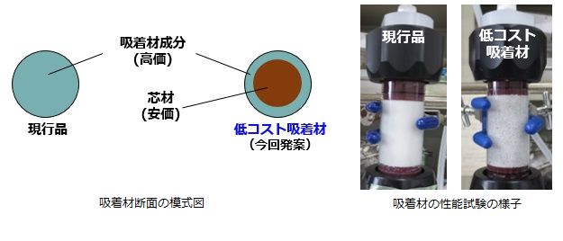 そこで高価な吸着材成分を粒の表層のみにコーティングした低コスト吸着材を試作しました。低コスト吸着材の性能試験をしたところ、福島第一原子力発電所の汚染水処理で使用している現行品と同じ性能が得られることがわかりました。従って、吸着材コストを低減出来る見込みが得られます。