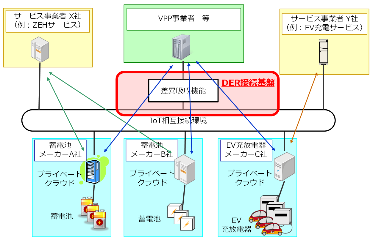 そこで、既存のIoTを用いた相互接続環境の上に、新たにDER接続基盤を開発し構築することで、 VPP事業者及び機器メーカー双方の課題の解決が可能となるとともに、システム上もシンプルな構成となることから、多様なビジネスへの適用が期待されます。