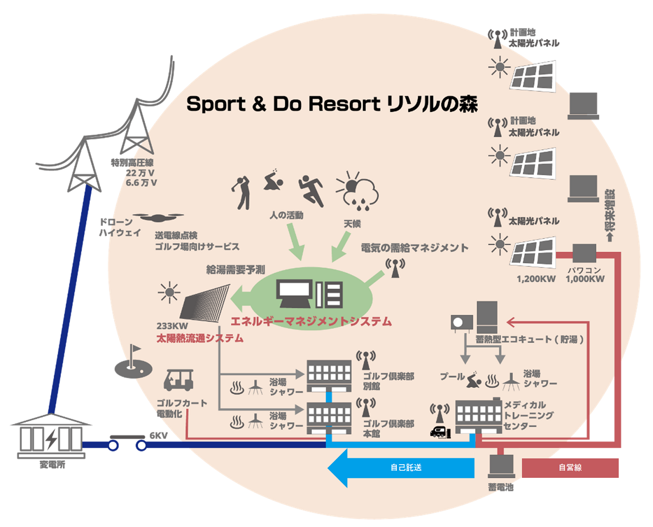 千葉県に所在する「リソルの森」において、太陽光発電で発電した電気を、同社の自営線及び送配電事業者の配電線(託送)で同社の需要場所へ供給し、エネルギーマネジメントシステムによって、蓄電池及びヒートポンプ式蓄熱機(エコキュート)等の電化機器を効率的に制御・運用する取組みを行っています。