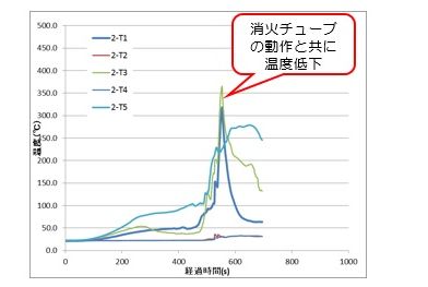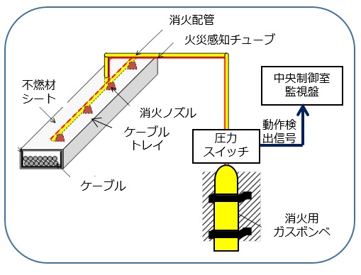 - トレイ内のケーブル火災による発熱でポリエチレンチューブが破裂し、さらに内包された消火剤蒸気圧が上昇して消火剤が噴出