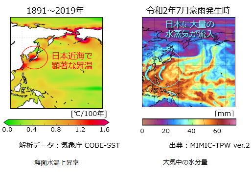 - 令和2年の九州豪雨(令和2年7月豪雨)の際に線状降水帯が長時間継続したのも、日本の南で海面水温が高く、大量の水蒸気が流入したことが要因と考えられます。