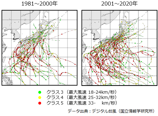 - 海水が温かくなると台風のエネルギー源である水蒸気の量が増えます。令和元年の台風15号、19号も、日本の南海域の海面水温が平年値より1~2℃高い状況下、強い勢力を保って日本に上陸しました。最近40年間で、東京への台風の接近数は約1.5倍に、中心気圧980hPa未満の強い台風の接近頻度は約2.5倍に増加しました。