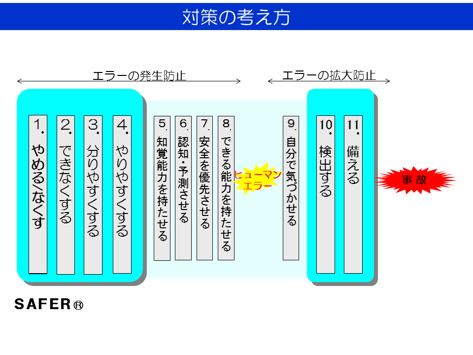 分析手法SAFER(Systematic Approach For Error Reduction)は、災害等の原因をm-SHELモデルを活用して多面的に分析し、その発生リスクを下げる対策を考案する手法です。人間を取り巻く要因を人間の特性に合うように改良し、「人間中心の環境」を構築することでエラーを未然に防ぎます。